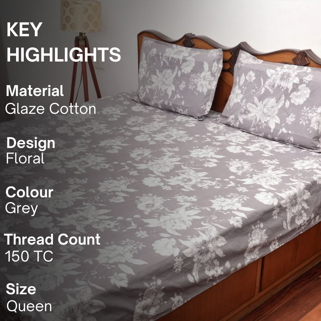 Add a touch of elegance to your bedroom with our Gray Garden double bed sheet. Measuring 90" x 100", this sophisticated design features delicate floral patterns in muted gray tones. Crafted from soft glaze cotton fabric, it ensures a comfortable and luxurious sleep experience. The set includes two matching pillow covers, perfect for creating a cohesive and serene ambiance. Ideal for those who appreciate understated beauty in their decor.