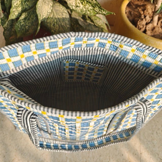 Fresh, cheerful, and effortlessly versatile, Check Box brings a playful checkered pattern to everyday carry. Featuring soft blue and yellow checks with a clean, structured look, this tote feels light, modern, and easy to style—perfect for those who enjoy classic patterns with a contemporary touch.