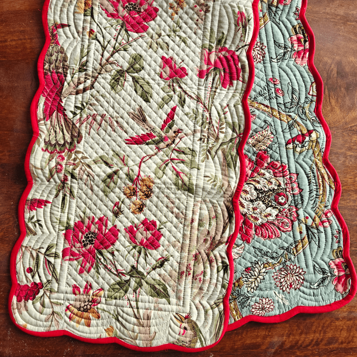 The reversible design gives you two coordinated looks in one — one side with blooming florals and birds, and the other with intricate meadow-inspired motifs. Finished with scalloped edges and contrast piping in deep red, this runner brings sophistication and a handcrafted charm to your dining space. The quilted texture adds both durability and a soft, structured feel.