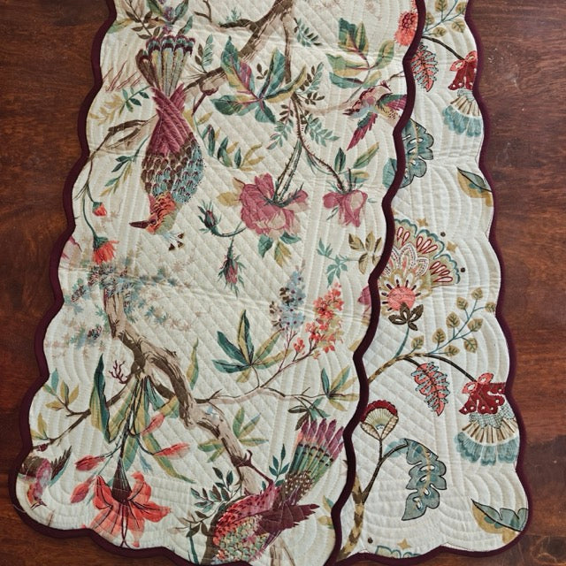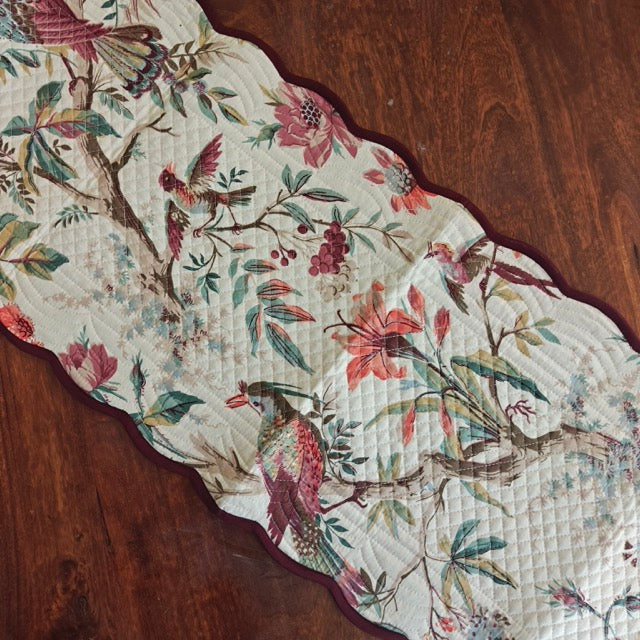 Bring a warm, vibrant energy to your dining table with the Ember Glow Quilted Reversible Table Runner. Inspired by nature in full bloom, this design features an intricate tapestry of florals and foliage, accented with beautifully detailed birds in rich shades of rust, coral, sage green, and muted teal — creating a look that feels lively yet grounded.