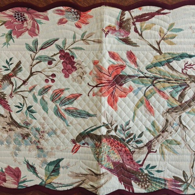 Design Style: Dual-sided floral and bird motifs, quilted texture, scalloped edges with contrast piping