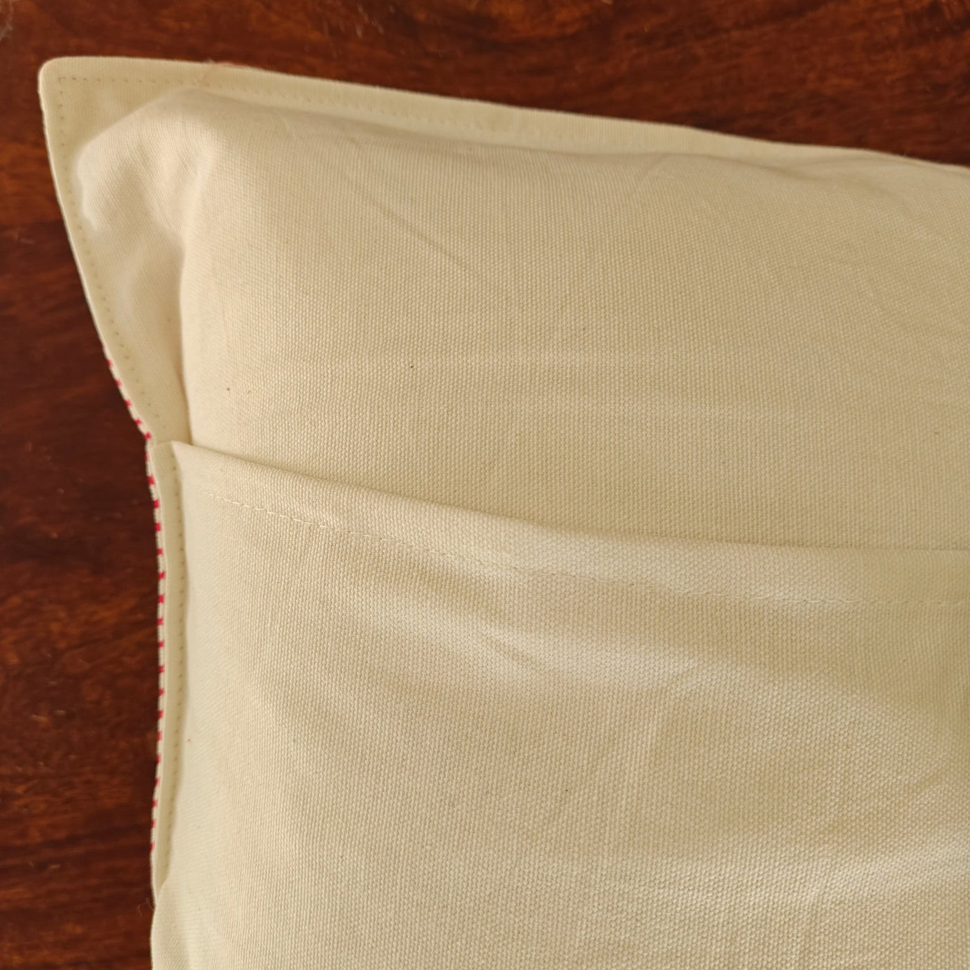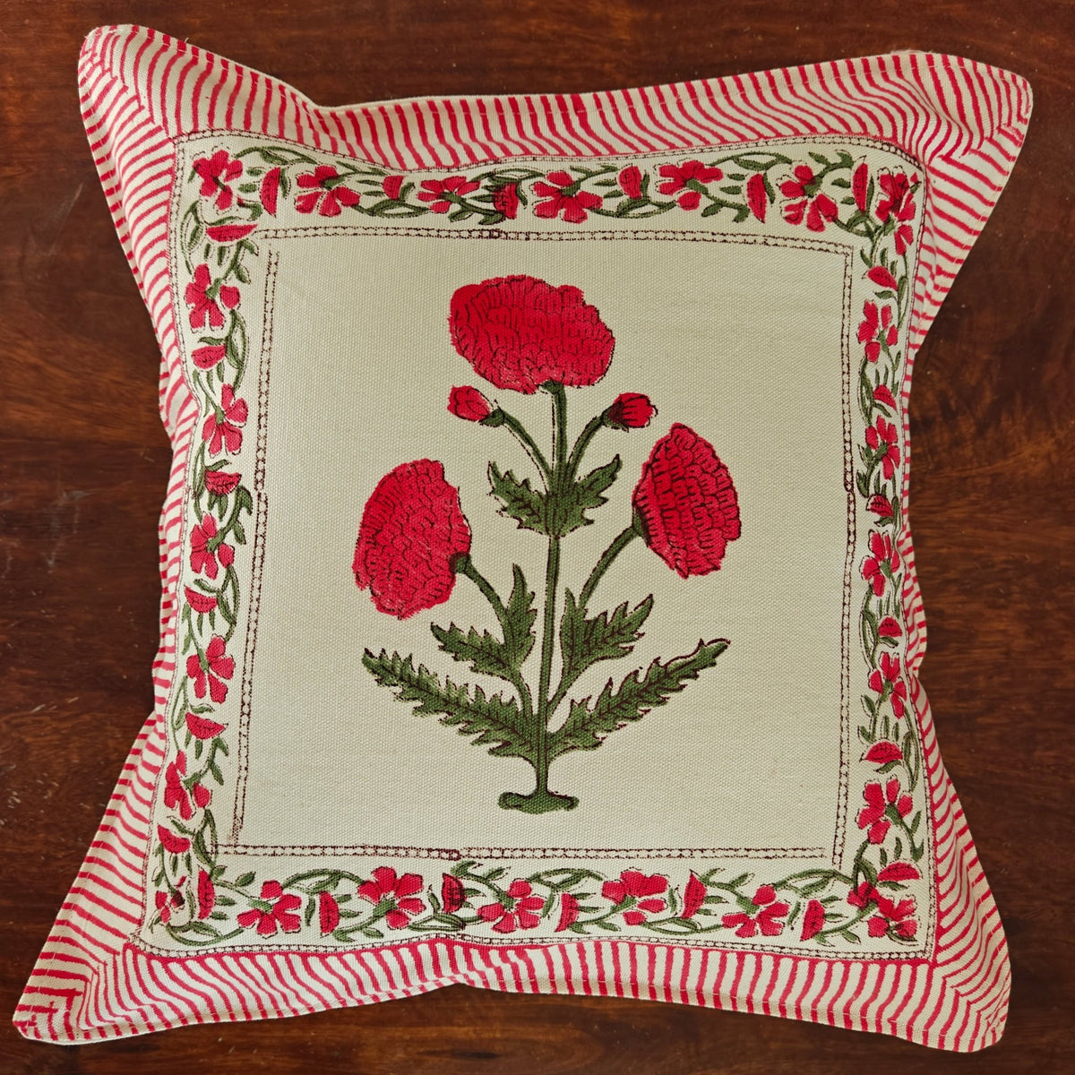 Add a bold yet graceful statement to your space with the Saira cushion cover set. Rooted in traditional block printing, this design features a striking central floral motif in deep red, framed by a delicate vine border and finished with classic striped edges. The interplay of structured borders and handcrafted florals creates a look that feels both vibrant and timeless.