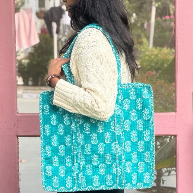 Rooted in calm hues and timeless block print motifs, the Ambar tote bag is designed to be your go-to everyday essential. Hand block printed with care, its soothing tones and intricate detailing make it both functional and effortlessly stylish.