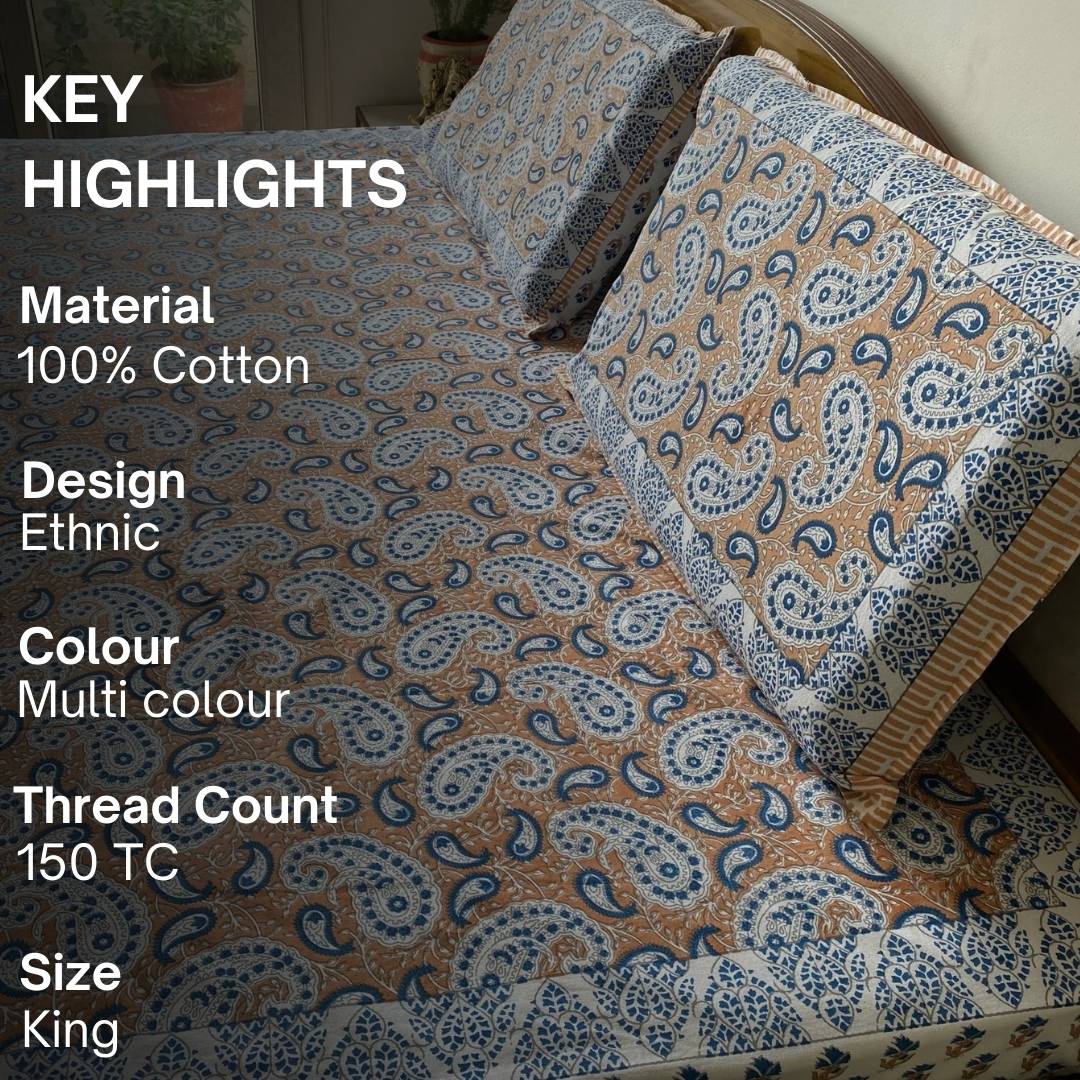 Introducing the "Kanchan" double bed sheet, crafted with an original handblock print on 100% cotton. The design features a rich, ornate pattern of paisley motifs in vibrant shades of blue on a warm brown background, perfect for bringing a touch of traditional elegance to your bedroom. This bed sheet is machine washable, combining style with practicality.