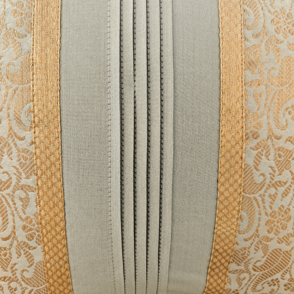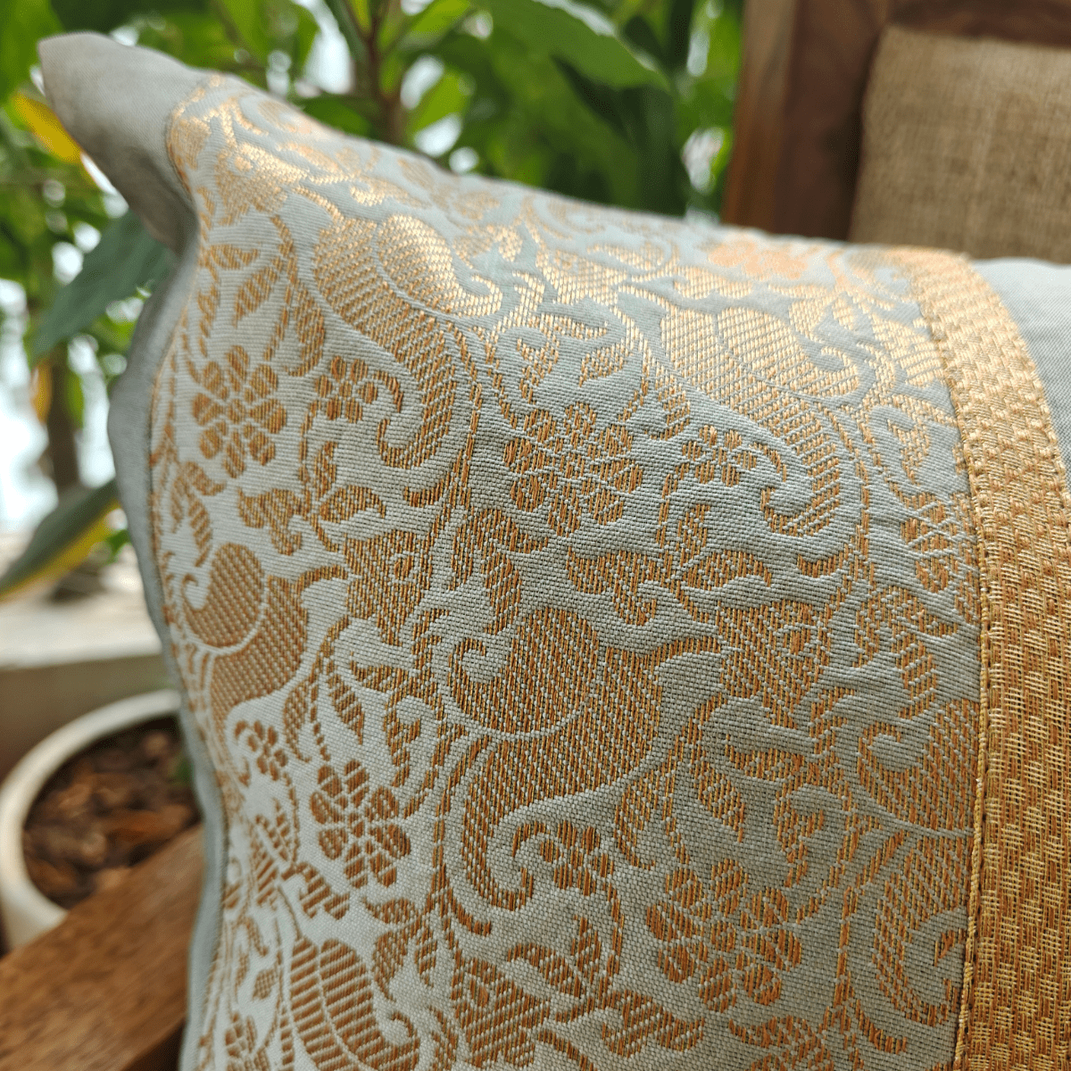 Bring home an understated elegance with the Quartz Cushion Cover, where subtle sheen meets timeless craftsmanship. Made from rich art silk and detailed with a premium polyester jacquard weave, this design features a soft dove-grey base adorned with intricate gold patterns and pleated detailing at the center — creating a refined balance of texture and luxury.
