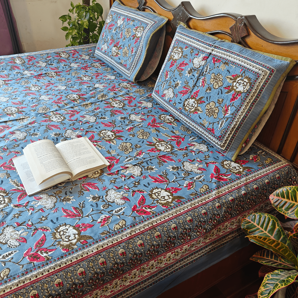 Bring a sense of calm elegance to your bedroom with Neer, a floral bedsheet inspired by flowing botanical forms and soothing blue tones. The intricate print, highlighted with subtle pops of red and earthy hues, adds depth and character while remaining effortlessly timeless.