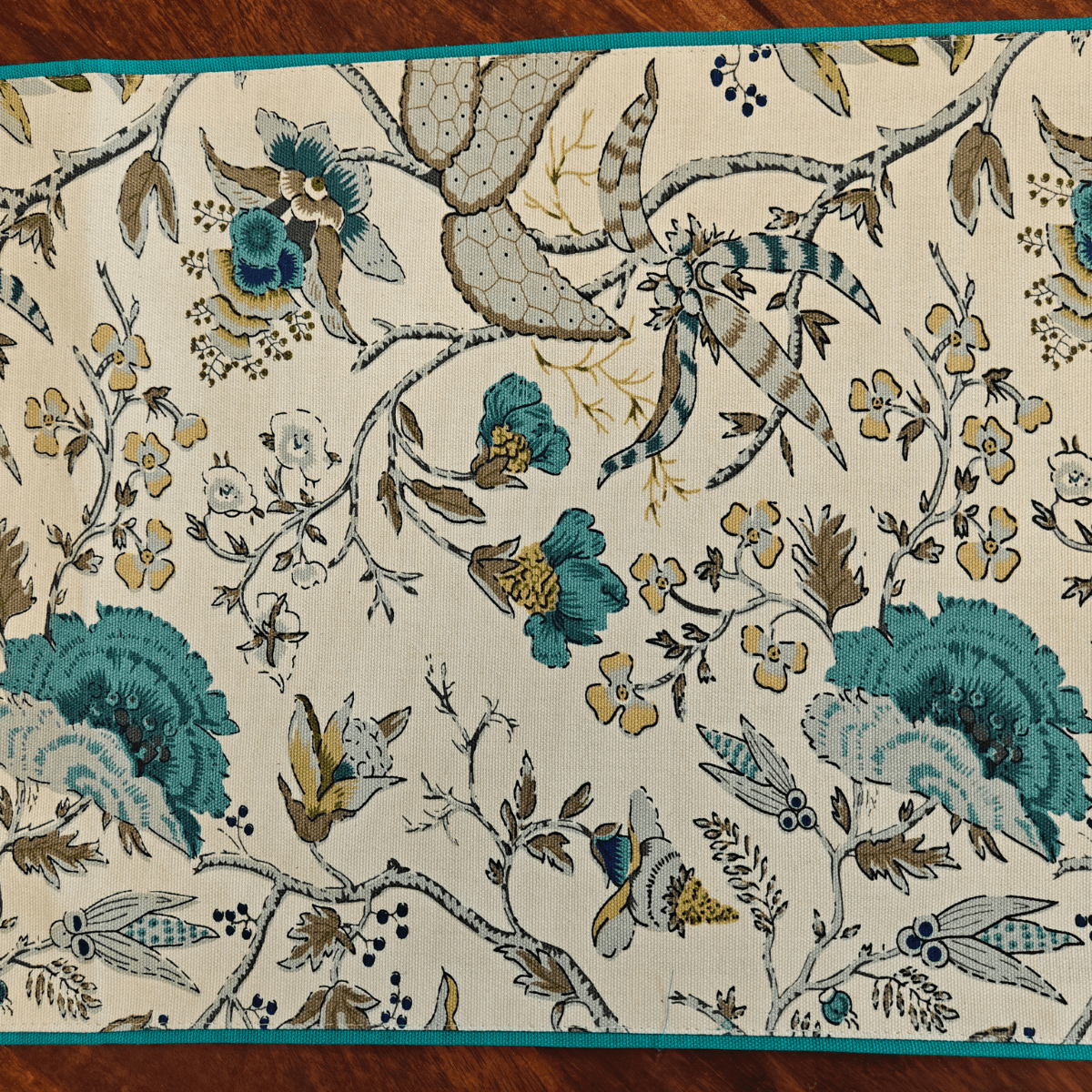 Add freshness and floral charm to your dining space with the Bloom Haven Table Runner by Coral Slub. Crafted from premium cotton canvas, this design features blooming teal and mustard florals with leafy branches delicately spread across an ivory base — bringing a calm, refreshing vibe to any setting.