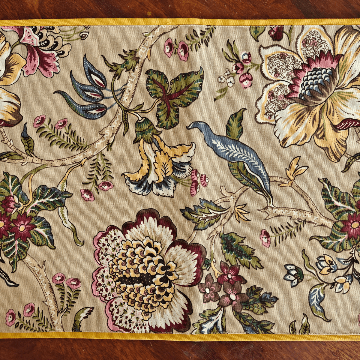 Infuse your dining space with earthy warmth and floral elegance through the Dune Bloom Table Runner by Coral Slub. Crafted from durable cotton canvas, this design features rich, blooming flowers in mustard, maroon, and blue tones set against a soft beige backdrop — a perfect blend of traditional charm and modern sophistication.